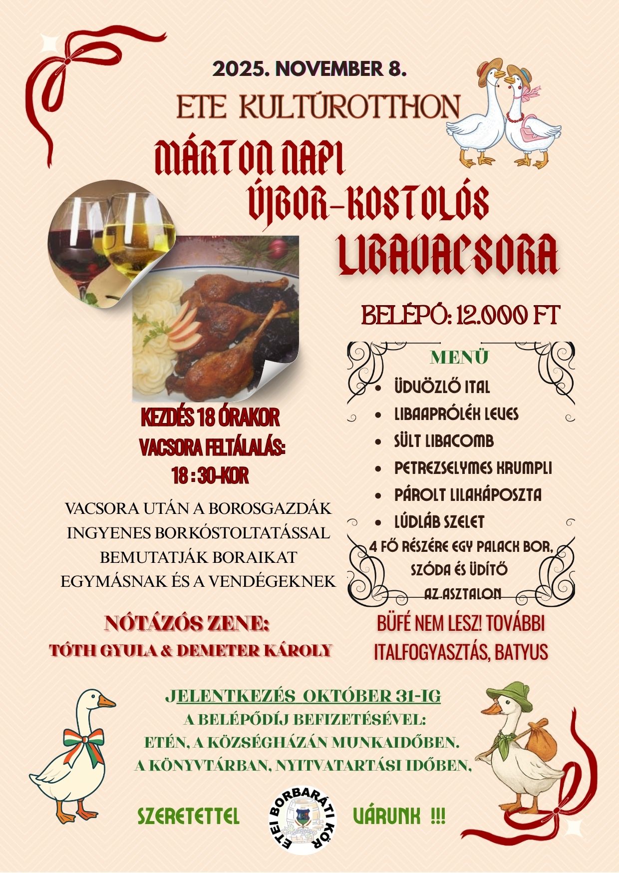 Több éves hagyomány, hogy a községben Márton nap környékén libavacsorát rendez valamelyik civil szervezet. Ennek a hagyománynak a tovább gondolása született meg egy két évvel ezelőtt az Etei Borbaráti Kör elnökségében. A libavacsorához a BBK az újborkóstolás hagyományát is hozzákapcsolta. Ennek a "párosításnak megfelelően november 8-án az idén is megrendeztük az újborkóstoló Márton Napi libavacsorát. A rendezvényt szűkebb körben szerveztük meg. Végül 56-an voltunk. A vacsoránt a Komáromi Kocsis Vendéglő biztosította. A nótázós zenét: Tóth Gyula&Demeter Károly duó szolgáltatta. A bevétel fedezte a kiadásokat.