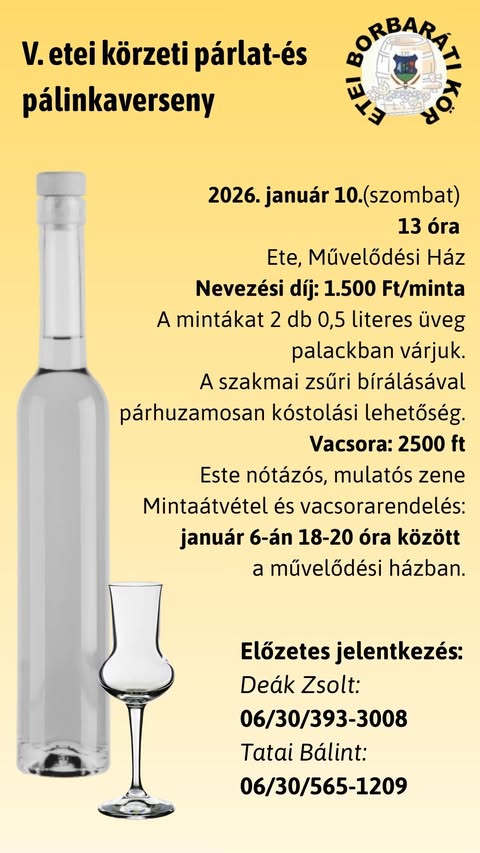 Az Etei Borbaráti Kör 2026. február 28-án, szombaton rendezi meg borversenyét Etén, a Művelődési Ház Kultúrtermében. /Ete Kossuth Lajos u. 67.