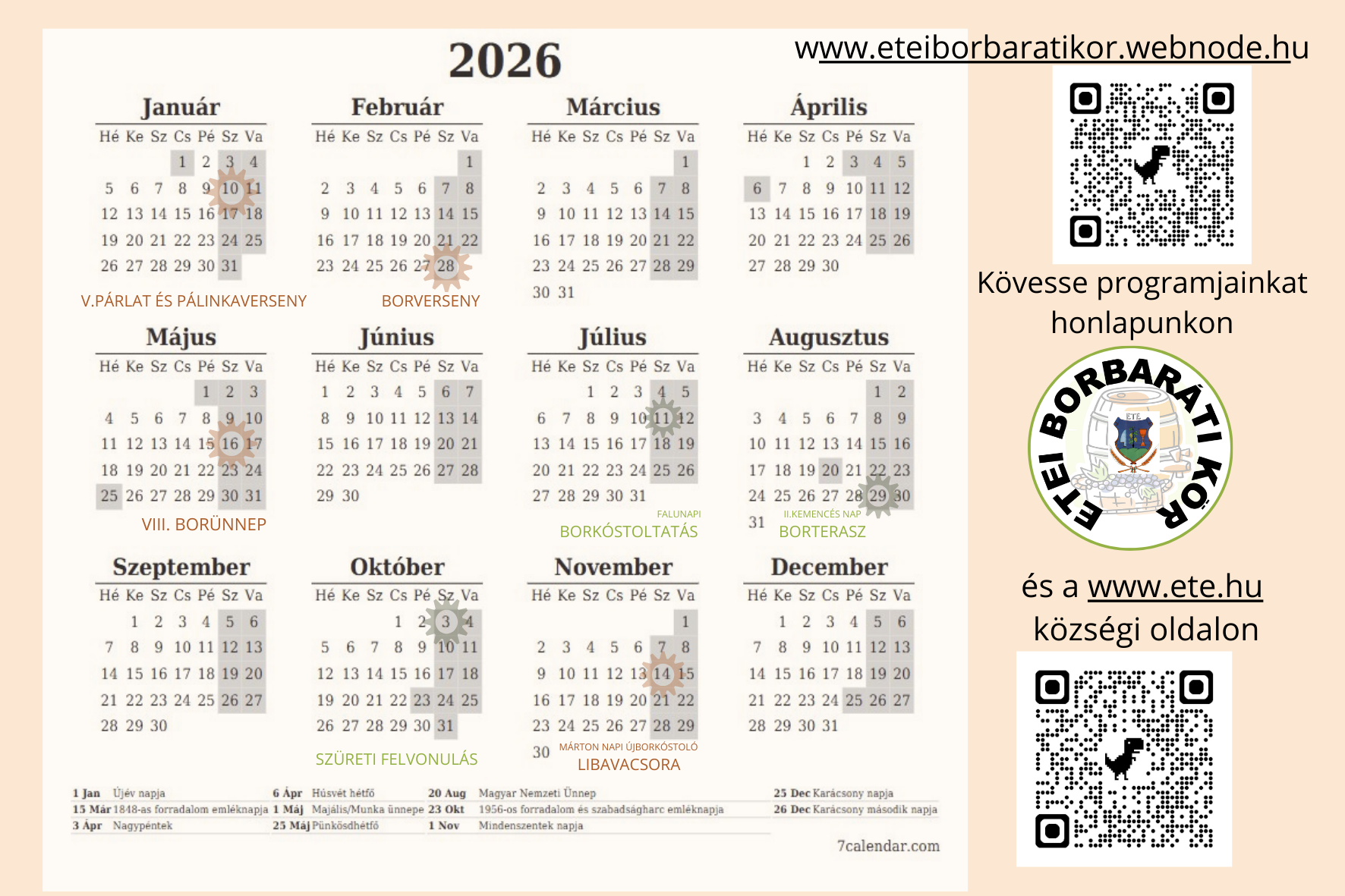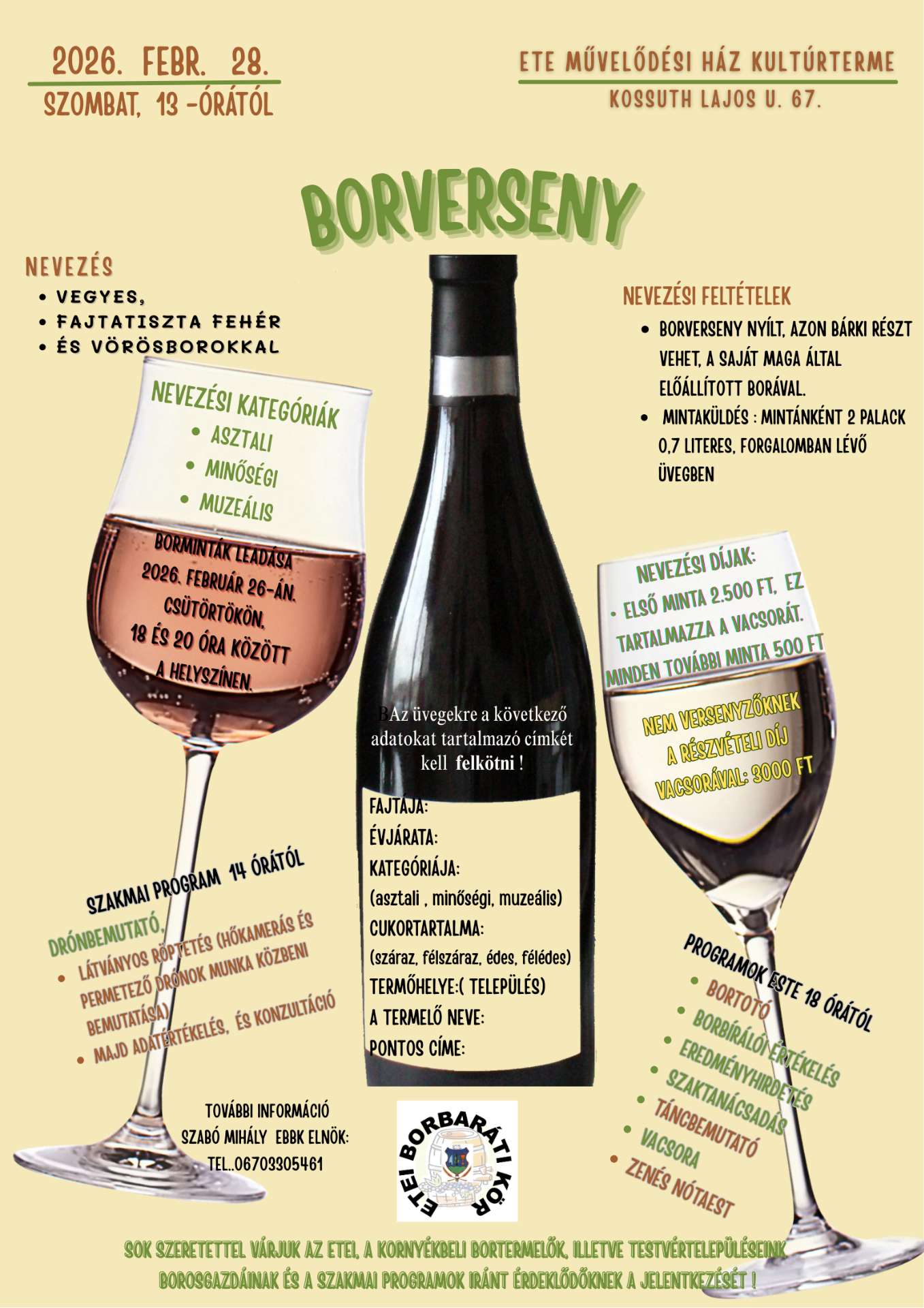 2026. február 28-án – Ete Község Önkormányzata hathatós támogatásával - rendeztük meg az idei borversenyt. Ez a rendezvény ismét bebizonyította, hogy Ete és a környező települések borkultúrája él, fejlődik és egyre magasabb minőséget képviseli. Az idei évben 95 bor minta érkezett be a versenyre. A minták jelentős részét Etéről hozták, de az ászári Bősze Csaba és a sóskúti Bibók Zoltán által vezetett két szakmai és a társadalmi zsüri megkóstolt és elbírált kisbéri, vérteskethelyi, tárkányi, hetényi vágfarkasdi és nagykeszi borokat is.24 Aranyérem, 46 Ezüstérem, 24 Bronzérem és 1 Oklevél minősítés született.